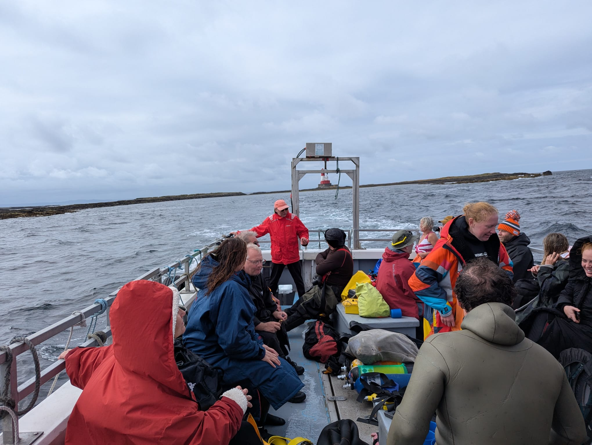 The journey to the islands is part of the adventure. You’ll often see seals hauled out on the rocks and seabirds overhead. Visitors pay for wildlife tours like this—our divers get the full above-and-below experience.